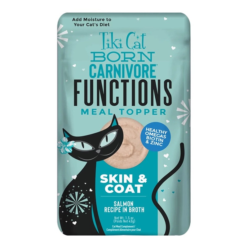 Supports Healthy Skin & Coat. Tiki Cat Solutions Skin + Coat Topper is a protein-rich gravy made with real salmon, omega-3 essential fatty acid sources, and vitamin E to supports healthy skin & coat. Top your cats kibble for an added boost of moisture and benefits or feed it as a treat.