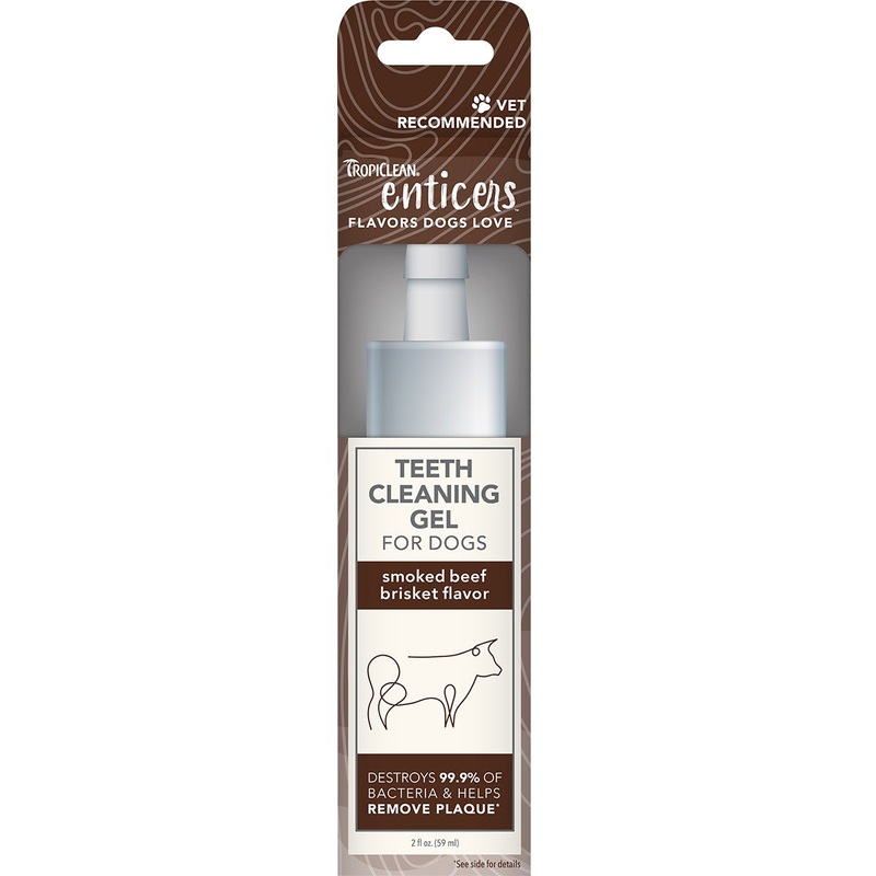 Say hello to your dog's new favorite delicacy. TropiClean Enticers Teeth Cleaning Gel is a savory oral care solution with a smoked beef brisket flavor that will have your dog begging for clean teeth. Gel is made with naturally derived ingredients and prove