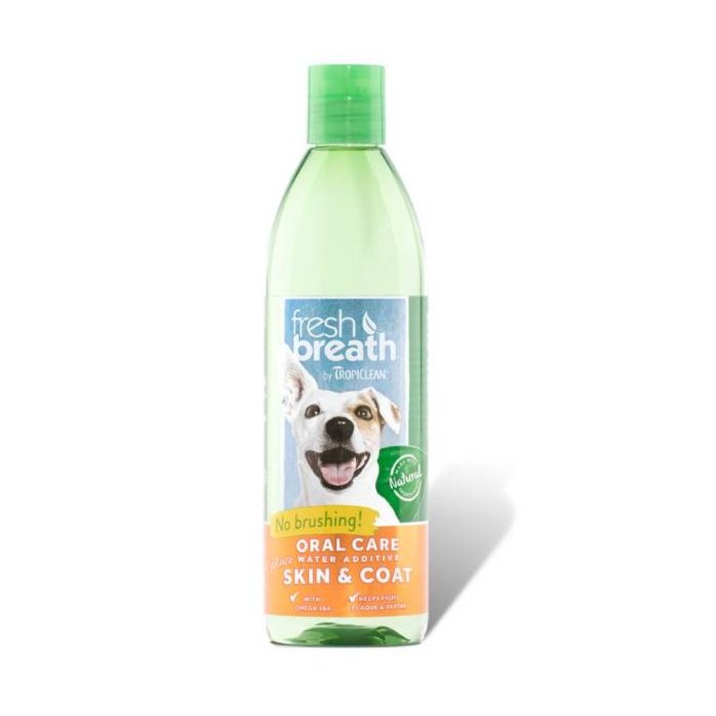 You can do a lot for your furry friends oral and overall health without using a toothbrush thanks to Fresh Breath by TropiClean Oral Care Water Additive Plus Skin & Coat for Pets. Just add a capful of this odorless and flavorless product to her drinking water with every refill to help improve her overall oral health. Its special blend of ingredients, including green tea, combats plaque and tartar while also fighting odor-causing bacteria. Plus, it contains omega 3 and 6 fatty acids to nourish her skin and coat! In just 14 days youll smell the difference in her breath, which lasts for up to 12 hours at a time when used as directed.