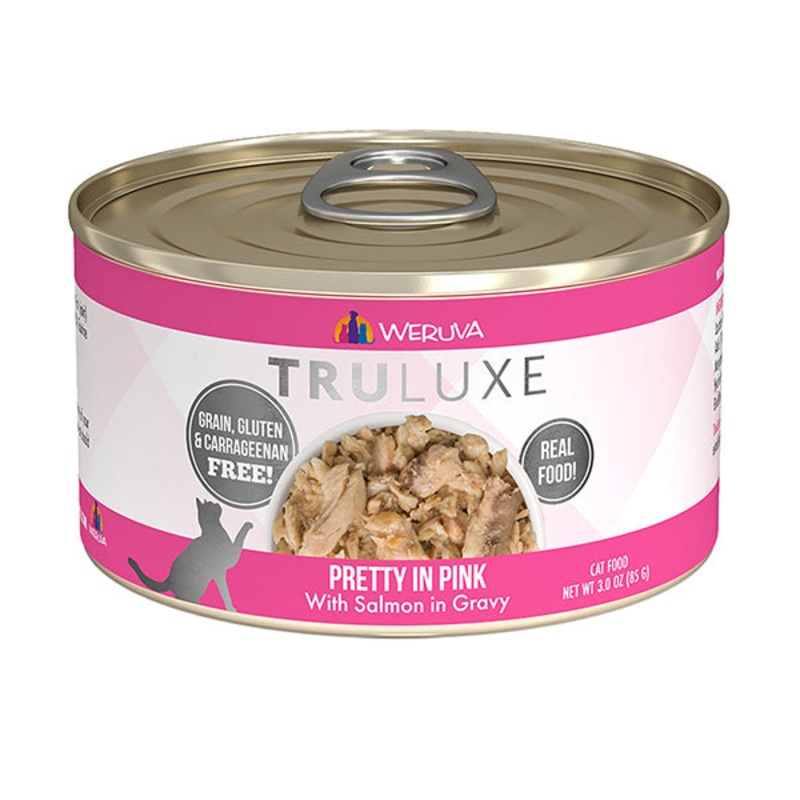 Fuel your little carnivore’s adventures with the Weruva Truluxe Pretty In Pink with Salmon in Gravy Grain-Free Canned Cat Food. Made with salmon and fish broth as the top ingredients, every juicy bite is loaded with the meat your pal craves, and all the protein he needs for healthy muscles. Since it’s formulated with a perfectly-balanced blend of vitamins, minerals and heart-healthy taurine, every easy-open can is actually a complete meal on its own or as a tasty kibble topper. Your kitty will love the meaty morsels and luscious gravy that also provides plenty of hydration so he can stay healthy, from nose to tail.