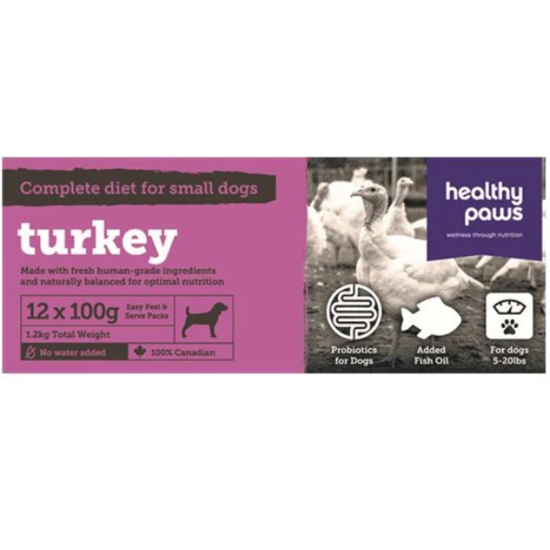 This item is frozen, and therefore, cannot be shipped.Healthy Paws Complete for Small Dogs is available in 10 different proteins to provide diversity to your small pet's diet. Each formula is based on a minimum 90/10 ratio of meat to fruit/vegetable blend.