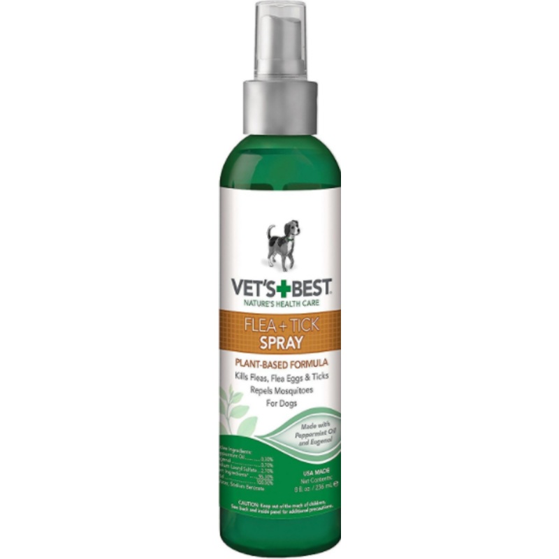 Vets Best Flea and Tick Spray kills fleas, flea eggs, ticks, and mosquitoes on contact, and repels mosquitoes after use