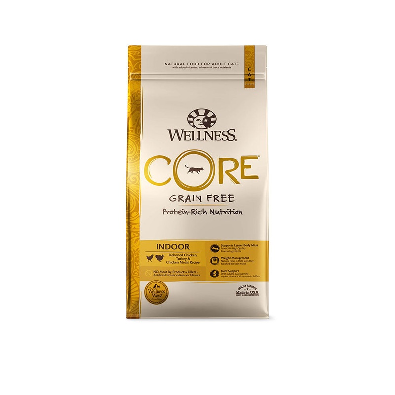 CORE Indoor recipe provides protein-rich, natural, grain-free nutrition. This nutrient-dense recipe is formulated with 10% less calories than CORE Original recipe for cats with a less active, indoor lifestyle. Wellness CORE Indoor Deboned Chicken, Turkey a