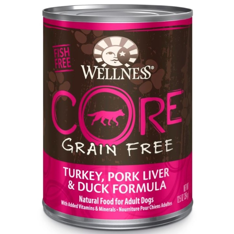 Wellness CORE Grain Free Natural Turkey, Pork Liver and Duck Recipe Wet Canned Dog Food is a great option for dogs who love variety! This protein packed recipe is filled with quality animal proteins like Turkey, Pork, and Duck without adding any fillers or grains. Fruits and vegetables like apples, blueberries, kale, sweet potatoes, broccoli and nutritional supplements are added for your dogs overall nutrition! If you’re looking for a food your dog is sure to love, then try Wellness CORE Grain Free Natural Turkey, Pork Liver and Duck Recipe Wet Canned Dog Food since it contains four high-quality protein sources, including 50% more protein than the original.
