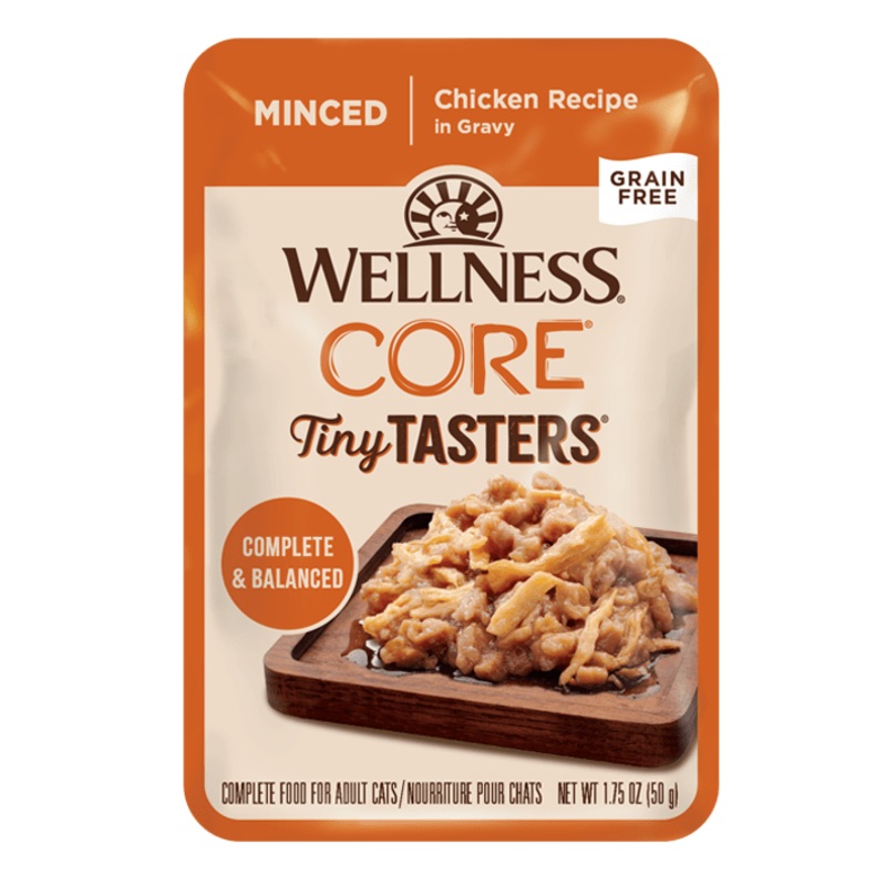 Wellness CORE Tiny Tasters Minced Chicken Recipe Cat Food is formulated to meet the nutritional levels established by the AAFCO Cat Food Nutrient Profiles for maintenance.