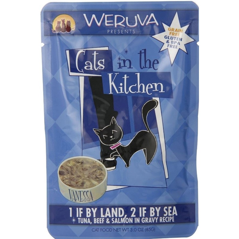 DescriptionWeruva Cats In the Kitchen 1 If by Land, 2 If by Sea Pouches are made with natural ingredients like Tuna, Beef and Salmon in a gravy sauce. This formula is completely grain-free and contains Vitamin K. These easy open pouches are a great alterna