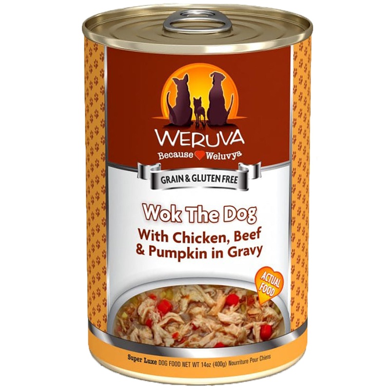 Weruva Wok The Dog Canned Dog Food 14oz.Your dog will be struttin' its full belly after dining on this feast of boneless, skinless, white breast meat chicken mixed with shredded beef, pumpkin, carrot and sweet potato. One meal your dog won't be "too sexy f
