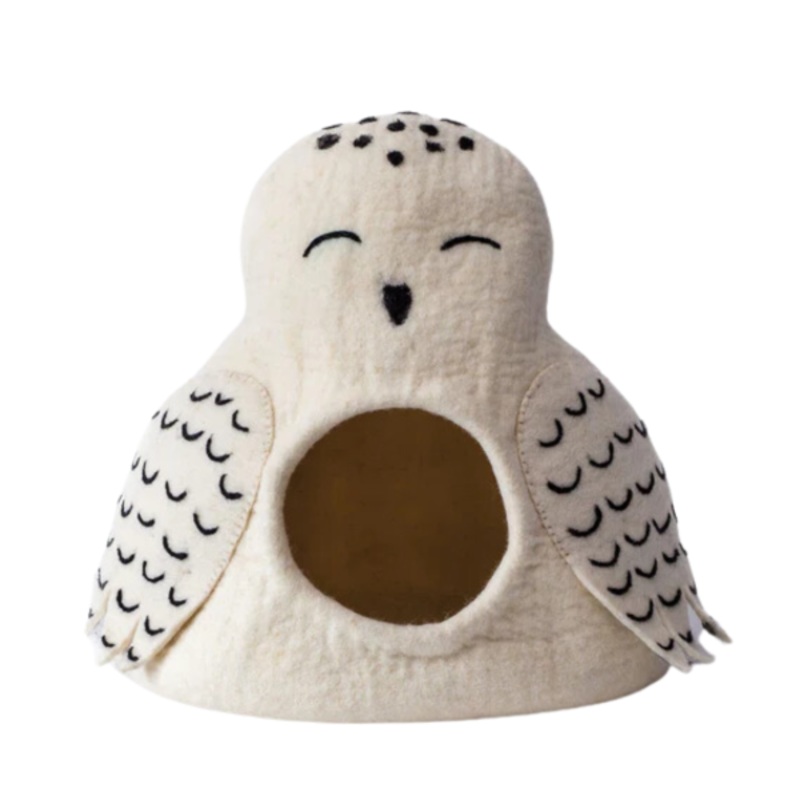 Who? Whos there? Oh, its just your furbaby hanging out with a snow owl.Dharma Dog Karma Cat handcrafted wool caves provide a cozy space for cats and small dogs to destress and sleep. The thick, rugged premium blend of Himalayan and New Zealand wools holds