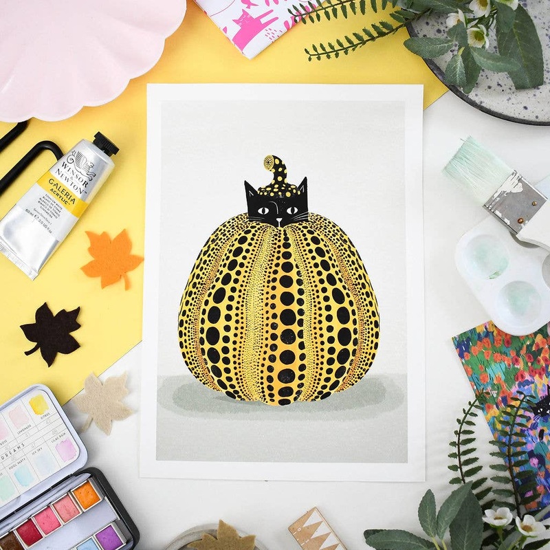 In this fun art print illustrated by Nia Gould, Yayoi Kusama's famous "Yellow Pumpkin" painting has been given a feline reimagining as "Yellow Cat Pumpkin." Looking for the purrfect wall adornment? Look no further!SpecificationsBrand: NiaskiDimensions: A4