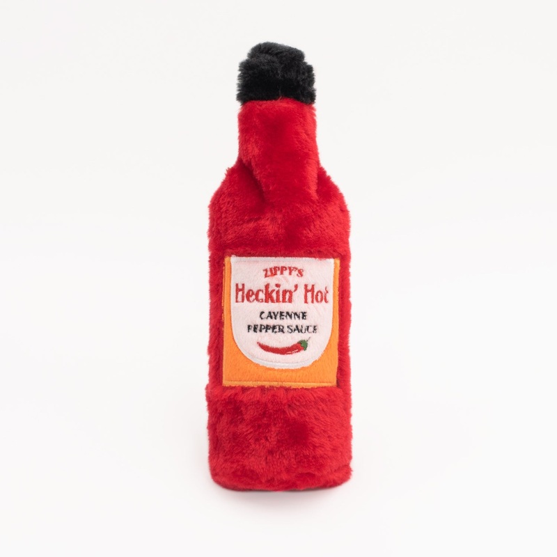 he ZippyPaws Hot Sauce Crusherz Heckin Hot is an interactive chew toy for dogs with a plush cover and an empty plastic water bottle (replaceable) inside. The water bottle comes with a reusable squeaky cap that fits most standard-sized water bottles. An ext