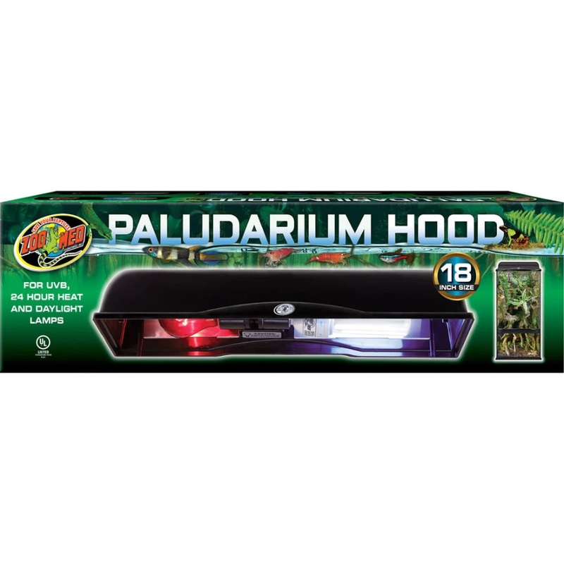 Zoo Meds new 18 (46cm) size PALUDARIUM HOOD is designed to fit all 18 inch wide PALUDARIUMS or NATURALISTIC TERRARIUMS. This hood can hold one PALUDARIUM 3-in-1 lamp and one incandescent heat lamp up to 60 watts (e.g. Zoo Meds Daylight Blue or Nightlight R
